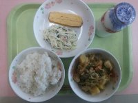 今日は、みなさんの大好きなカレーです。お肉は少なめですが、ゴツゴツした形の「ひよこ豆」が入っています。ひよこ豆は、西アジアが原産です。種子がひよこの頭に似ていることからこの名前がつきました。カレーやスープ、煮込み料理などに使われます。給食でもよく登場しますので、覚えておきましょう。今日も、残さないようにしっかり食べましょう。