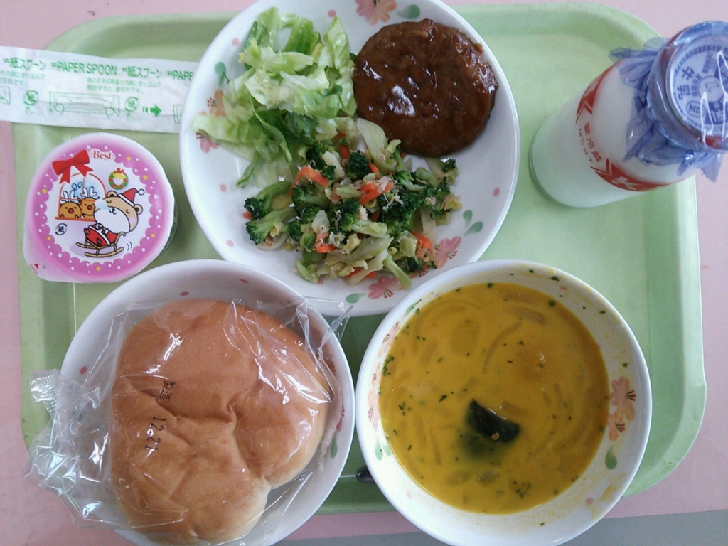 今日は、少し早い「クリスマス」メニューです。てりやきチキンをはさんで食べる「セルフバーガー」とカップデザートがあります。また、今日は『冬至』ですので、かぼちゃを使ったポタージュを一緒に出しています。冬至については、給食の献立表に載せていますので、ぜひ見てください。お友達といろいろな話をしながら、たのしい給食にしてください。