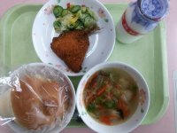 牛乳、火の国パン、あじフライ、スプリングサラダ、朝霧スープ