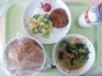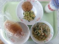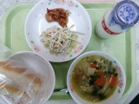 今日は、ヘルシーな豆腐を使ったハンバーグです。トマトケチャップのソースをかけて出しました。サラダやスープも野菜たっぷりでどれもヘルシーなメニューです。野菜をたくさん食べると、とても体によく「かぜ」の予防にもつながります。お家でも、給食と同じようにしっかり野菜を食べるように心がけましょう。