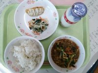 牛乳、麦ご飯、焼き餃子、ほうれんそうと大根の中華和え、マーボー春雨