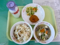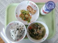 牛乳、ワカメご飯、竹輪のい草揚げ、ちりめんサラダ、団子汁