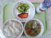 今日は、魚の塩焼きやごま和え、けんちん汁の組み合わせでみんなが安心する「和食」のメニューです。塩焼きには「鮭」を使いました。油がのって美味しいのですが、単価が高くなり高級魚になってしまって給食に頻繁に出すことが出来なくなってしまいました。残さないようにしっかり食べましょう。