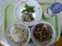 今日は、多良木産のお米に県産品の大麦(ぷちまる君)と雑穀米のもちきびを入れて炊いた「三穀めし」です。月に1回ぐらいは出していますがみなさん覚えていますか。大麦のぷちまる君は、丸い麦のまま炊くことができ、ぷちぷちとした食感が楽しめます。いつもの麦ごはんの中に入っています。もちきびは、黄色で小さくまるこい形をして入っています。食べながら見てみてください。そしてよく噛んで食べていると、いつもよりももちもちした感じがありませんか?どうですか?今日も、残さないようにたべましょう。