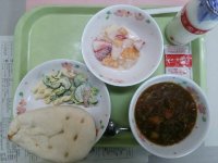 今日の給食は、多良木町の6年生に募集したこんだてのひとつです。多良木小6年2組さんに考えてもらった、「赤・黄・緑3色そろった献立」だそうです。栄養バランス的にはたんぱく質とカルシウムが少し多めですが、フルーツヨーグルトを入れることでビタミン類の摂取が上がり、よい献立でしたので採用しました。ナンとカレーもありますので、楽しみながら給食を食べてください。