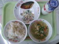 牛乳、麦ご飯、鮭の塩焼き、ちくわとキャベツのごま和え、味噌けんちん汁