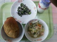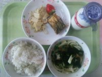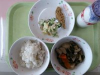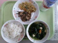 今日は、畑の肉と呼ばれる「大豆」を使った煮物です。大豆は、たんぱく質のほかに鉄分、ビタミンB1を含んでいます。大豆には、黄大豆、青大豆、黒大豆の種類があります。また、加工品も多く作られていて豆腐や油揚げ、納豆、黄粉、醤油などのさまざまな食品として出回っています。残さず食べましょう。