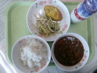 今日は、韓国料理の「ビビンバ」です。お肉と野菜のナムルをごはんと混ぜながら食べましょう。ピリ辛の味付けで、ごはんが進む一品です。わかめたっぷりのスープと一緒に食べましょう。よく噛んで味わいながら食べましょう。