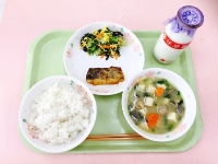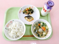 牛乳、麦ご飯、豚汁、塩鯖、小松菜のごま和え