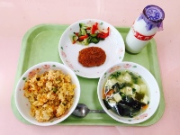今日の給食にはみなさんが大好きなチキンライスがあります。チキンライスは日本発祥の焼き飯料理と言われています。具材には鶏肉や玉ねぎが入っていて、トマトケチャップで味付けしています。今日の給食もよく噛んで残さず食べてくださいね。