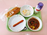 今日は、セルフドックになっています。パンにウインナーを上手にはさんで食べてください。ビーフシチューには牛肉、にんじん、玉ねぎ、じゃがいも、ひよこ豆など、たくさんの具材が入っておいしく出来上がっていると思います。お昼からも元気に過ごせるよう、今日の給食も残さず食べましょう。