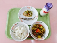 牛乳、麦ご飯、野菜のカレー煮、焼きししゃも、もやしのごま和え