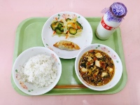 牛乳、麦ご飯、麻婆豆腐、ジャンボ餃子、キャベツのナムル