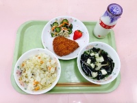 牛乳、チキンライス、わかめスープ、やさいコロッケ、ドレッシングサラダ