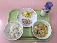 今日は「納豆の日」なので、給食にも納豆を出しています。納豆は日本で昔から食べられている食品で栄養たっぷりです。また「ししゃもフライ」のししゃもは小さいですがカルシウムをとても多く含んでいます。頭からしっぽまで残さないようによく噛んで食べましょう。