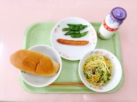 牛乳、ミルクパン、スパゲッティペスカトーレ、ほうれんそうのサラダ、アーモンドフィッシュ