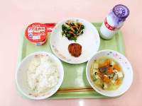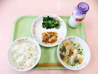 牛乳、麦ご飯、味噌けんちん汁、さつま揚げの照り煮、小松菜の煮びたし風サラダ