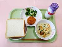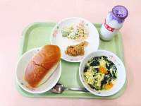 牛乳、ミルクパン、卵と豆腐のスープ、鶏肉のからあげ、オーロラサラダ