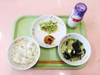 牛乳、麦ご飯、じゃがいもの味噌汁、鶏肉の梅マヨネーズ焼き、キャベツのおかか和え
