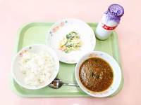 牛乳、麦ご飯、キーマカレー、ブロッコリーサラダ