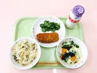 今日の給食には、みなさんが大好きな「鶏肉のからあげ」があります。鶏肉は、高たんぱく低カロリーで、ビタミン類を豊富に含んだ食品です。また、今日のサラダはオーロラサラダですが、オーロラソースとは、マヨネーズとケチャップを混ぜ合わせて作ったソースのことです。今日の給食もよく噛んで残さず食べてくださいね。