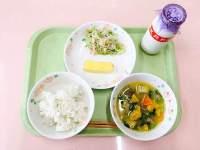 牛乳、麦ご飯、かぼちゃだんご汁、厚焼き卵、ビーフンの酢の物