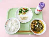 牛乳、麦ご飯、タイピーエン、ミニ肉まん、ほうれんそうと大根の中華和え