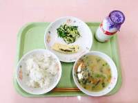 牛乳、麦ご飯、おひめさん団子汁、千草焼き、白菜と昆布の即席漬け