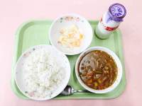 今日の給食はみなさんに人気のカレーです。豚肉を使って「ポークカレー」を作りました。早く食べてしまいがちですが、一口30回を目標によく噛んで食べましょう。