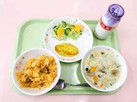 チキンライス、きのこシチュー、オムレツ、みかんサラダ