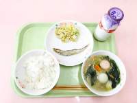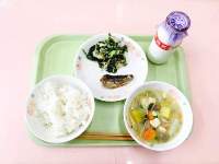 牛乳、麦ご飯、さつま汁、いわしのしょうが煮、ほうれんそうのごま和え