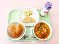 今日はロシア料理の献立です。「ボルシチ」は、ビーツや玉ねぎ、ニンジン、キャベツ、炒めた牛肉などをじっくり煮込んで作る具だくさんのスープです。「ボルシチ」はウクライナ語で草や薬草の煮汁を意味する言葉です。また、「ピロシキ」もロシア料理の一つで、小麦粉を練った皮で、肉・魚・野菜などの具を包み、油で揚げて作ります。ロシアで昔から食べられている伝統的な料理です。今日の給食もよく噛んで味わって食べてくださいね。