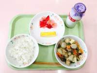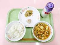 今日は中華の献立です。マーボー豆腐はピリ辛の味付けでおいしく仕上がっていると思います。シューマイもみなさんに人気のメニューの一つです。今日の給食もよく噛んで残さず食べましょう。