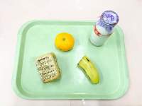 今日は町内の水の状態が良くなかったので、急きょ献立を変更しました。非常食の乾パンとみかん、バナナ、牛乳です。