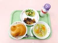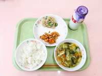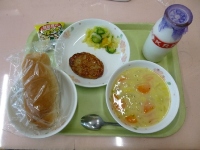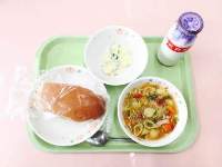 牛乳、麦ご飯、八宝菜、大豆と海老の揚げがらめ、もやしの中華和え