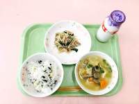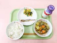牛乳、麦ご飯、鉄火煮、焼きししゃも、菜の花和え