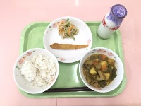 牛乳、麦ご飯、野菜のカレー煮、こもちししゃもフライ、もやしのごま和え