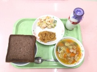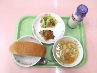 牛乳、コッペパン、オニオンスープ、鶏のピカタ、スプリングサラダ