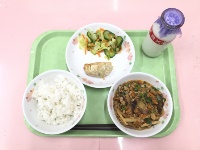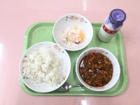 今日は中華料理の献立です。マーボー春雨はつるつるとのどごしがよく、ピリ辛で食欲が進む味付けになっていると思います。キャベツのナムルにはごま油を入れて風味よく仕上げています。一口30回を目標に今日の給食もよく噛んで残さず食べましょう。