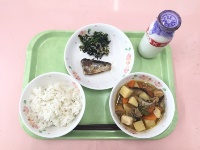 牛乳、麦ご飯、肉じゃが、イワシの生姜煮、ほうれん草とひじきの和え物