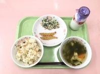 牛乳、山菜おこわ、わかたけ汁、きびなごのカリカリフライ、かわり白和え