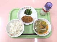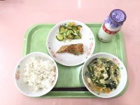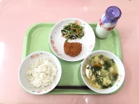 牛乳、麦ご飯、かきたま汁、ロースとんかつ、小松菜のピーナッツ和え