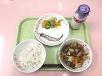 牛乳、麦ご飯、うま煮、焼きシシャモ、みかんサラダ