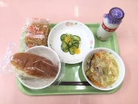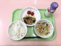 牛乳、麦ご飯、ちゃんぽん、なすの味噌炒め、ミニトマト