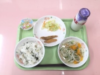 牛乳、まめわかめごはん、七夕そうめん汁、きびなごのカリカリフライ、キャベツの甘酢和え、七夕ゼリー
