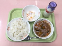 今日の給食は、夏野菜をたっぷり使った「夏野菜カレー」です。夏野菜は、水分やカリウムをたっぷり含んでいるものが多く、身体にこもった熱を身体の中からクールダウンしてくれます。給食をしっかり食べて、暑い夏に負けない元気な身体を作りましょう。また、今年度は「全学校残菜ゼロ」の日があまりありません。カレーとフルーツヨーグルトはみなさんに人気のメニューですので、「残菜ゼロ」を目指して食べてくださいね。