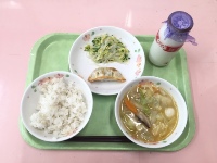 牛乳、麦ご飯、八宝菜、餃子、バンサンスー