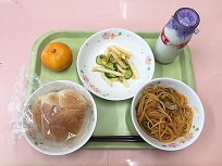 牛乳、米粉パン、スパゲティナポリタン、揚げじゃがサラダ、みかん