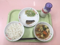 牛乳、麦ご飯、五目大豆煮、イワシの生姜煮、キャベツのゆかり和え