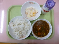 今日の給食は、みなさんに人気の「チキンカレー」と「フルーツヨーグルト」です。今日のフルーツヨーグルトにはりんごが入っています。好きなメニューは早く食べてしまいがちですが、一口30回を目標によく噛んで食べてくださいね。残菜ゼロを目指して食べてほしいと思います。